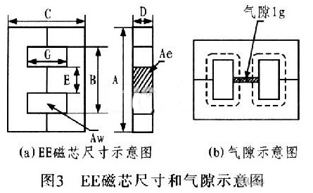 单端反激式变压器的设计和制作时必须引入气隙,否则会出现磁芯饱和,本设计和制作选择在所选EE系列磁芯两边垫磁性材料使磁回路加入适当的气隙,如图3(b)所示。
