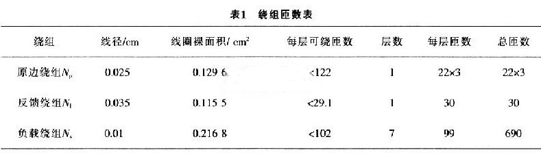 为了减小高频干扰的影响,在计算绕组线径时,电流密度K取值比计算面积时稍微小一点,取值500 A/cm2,以使得导线线径在满足绕组电流和功率的情况下选用细导线并绕的方式绕制原边绕组,设计中采用O.025 cm线径的导线,并绕线数,取3线并绕的方式绕制原边线圈。