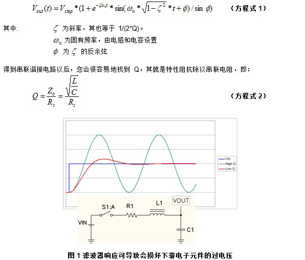 高 Q(低阻尼)系统为无阻尼,而滤波器输出电压可振铃至两倍输入源 (Vin)。低 Q 系统会限制峰值振铃电压。