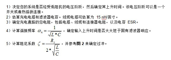 总之,阶跃输入电压带来的滤波器振铃可导致对下游电子元件有破坏性影响的电压。特别是如 PoE 的系统,在使用低损耗陶瓷电容和一些不饱和的电感时它们往往为高 Q,则上述电压便成为问题。如果电压达到不可接受的水平,则这些系统会需要更多的阻尼、电流限制或者一种替代充电方法。下面将介绍一种确定您是否存在问题的简单过程:
