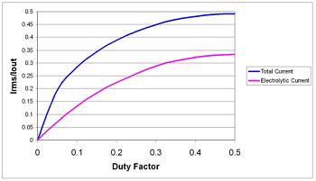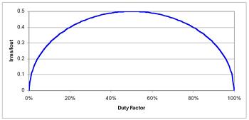 图 1 给出了该表达式的曲线图;它是一个圆形,其中,50%占空比时达到最大值0.5,并在 0% 和 100% 占空比时有 2 个零交叉。该曲线在 50% 占空比附近对称。在 20% 和 80% 之间,RMS 电流和输出电流之间的比大于 80%。使用这一范围的占空比,您可以将 RMS 电流粗略估计为 1/2 最大输出电流。在这一范围之外,您需要进行相应的计算。