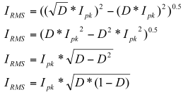 下面是输入电容中RMS电流的推导过程,其假设电感无穷大。它以矩形脉冲(D0.5*Ipk)的RMS电流作为开始,并去除了DC组件(D*Ipk)。