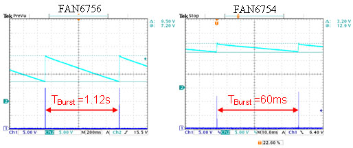 将飞兆半导体新、旧PWM IC:FAN6756 与FAN6754 置于相同的测试板上 (其额定输出电压/电流规格为19V/3.42A),量测无载时与输入电压为230V时的相关参数值,并将这些实测参数带入表一中所提的无载损耗计算式, 可得到如表三所计算的损耗值。以前的 PWM IC (FAN6754) 并没有集成飞兆半导体的创新节电技术,所测得的无载损耗为 73mW。