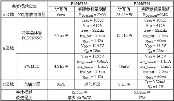 表三、FAN6756 与 FAN6754 无载的主要损耗计算表(不含变压器损耗)
