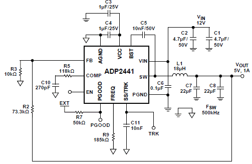 图4.ADP2441典型应用电路图(3): VIN = 12 V ± 10%, VOUT = 5 V, fSW = 500 kHz