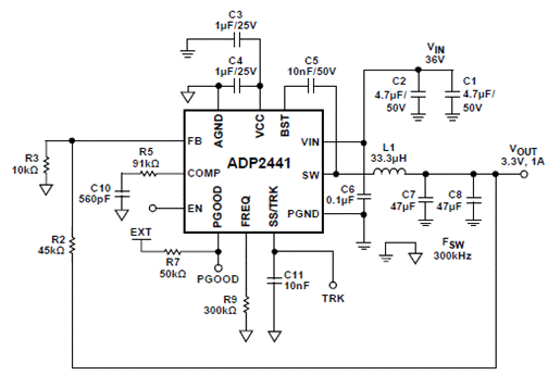 图5.ADP2441典型应用电路图(4): VIN = 36 V ± 10%, VOUT = 3.3 V, fSW = 300 kHz