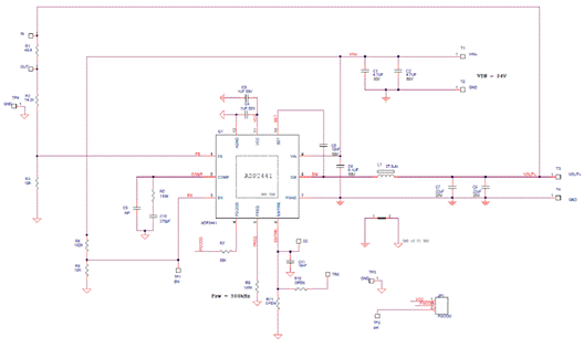 图2.ADP2441典型应用电路图(1): VIN = 24 V ± 10%, VOUT = 5 V, fSW = 700 kHz