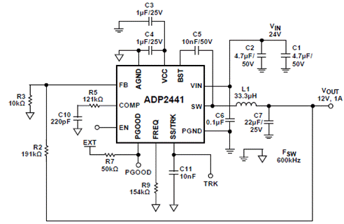 图3.ADP2441典型应用电路图(2): VIN = 24 V ± 10%, VOUT = 12 V, fSW = 600 kHz