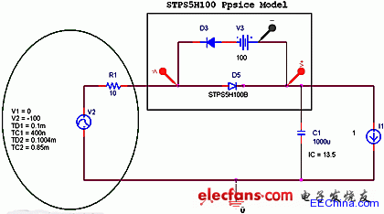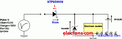 这个100V VRRM的二极管将激活成反向模式,因为在其端子上的电压是-113.5V(由于电容电荷的原因等于Vsurge + Vbat)。