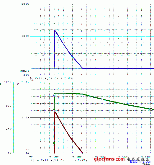根据图12(下面第一张图)所示原理图进行Pspice仿真结果可以显示SPTS5H100消耗的功率,如图13所示(下面第二张图)。