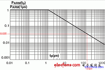 图14:归一化的雪崩功率降级与脉冲持续时间关系。(STPS5H100数据手册中的图3)