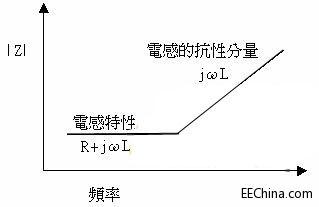 电感是用来控制PCB内的EMI。对电感而言,它的感抗是和频率成正比的。这可以由公式:XL = 2πfL来说明,XL是感抗(单位是Ω)。例如:一个理想的10 mH电感,在10 kHz时,感抗是628Ω;在100 MHz时,增加到6.2 MΩ。因此在100 MHz时,此电感可以视为开路(open circuit)。在100 MHz时,若让一个讯号通过此电感,将会造成此讯号质量的下降(这是从时域来观察)。和电容一样,此电感的电气参数(线圈之间的寄生电容)限制了此电感只能在频率1 MHz以下工作。