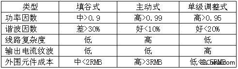 前面分别对三种功率因素校正结构做了介绍和相关实验,可以看出各结构都有其自身的特点,表6.1对三种功率因数校正方式做了比较说明,功率因数和谐波性能最好的是主动式功率因数矫正反激式转换结构,但其缺点是线路复杂度和元件成本比其它两种都要高;填谷式功率校正结构的缺点就是功率因数不够高,谐波性能还是不好,元件成本虽然比主动式结构低,但还是比单极式结构要高;单级功率因数校正结构在谐波和功率因数性能上能完全满足IEC63000-3-2的要求,其功率因数调整方式不仅结构简单,而且外围元件成本也最低;另一方面,在单级调整式结构中,因为桥式整流后的滤波电容容量很小,一般100~200nF左右,所以,输出电流的低频纹波会比前面两种结构都要大一些,不过可以通过加大输出端电容容量来解决这个问题。