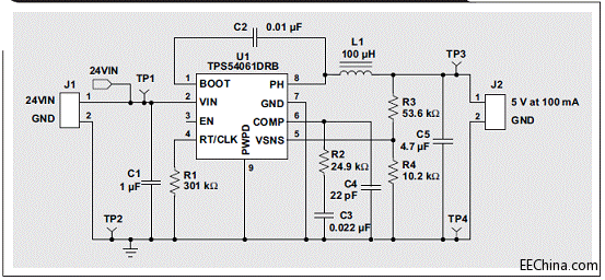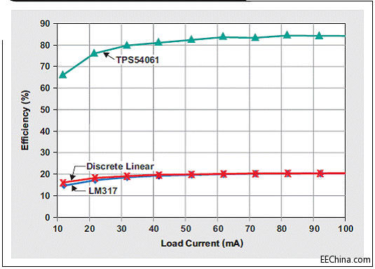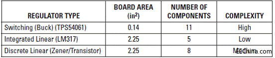 图1所示设计使用一个具有集成MOSFET的同步降压转换器,即德州仪器的TPS54061。注意,该电路并不要求使用一个保护二极管,但却包含了1个电感、5个电容器和4个电阻器。该器件还使用了外部补偿,并使用与图2和图3所示线性电路一样的输入和输出电容器。