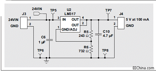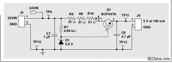 大多数工业应用都使用24V总线,并要求5V电压来驱动各种负载,例如:逻辑和低电流微处理器等。我们选择100mA的输出电流,原因是它可适应许多逻辑和处理器负载。但是,功耗水平会影响我们使用开关式稳压器还是线性稳压器的决定。图1、2和3所示电路均建立在相同电路板基础上,并使用相同额定值的1µF输入和4.7µF输出陶瓷电容器。