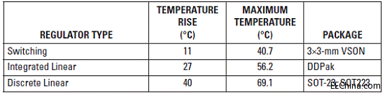 线性稳压器解决方案要求使用更多的板面积来缓解电路板上的热问题。全负载下时,所有线性稳压器解决方案的功耗都必须达到约2W。一般而言,1平方英寸板面积内,1W左右的功耗会带来100°C的温升。按照设计,线性稳压器解决方案仅允许40°C的温升。如果不考虑外部组件的数目以及补偿反馈环路和选择电感的大量设计工作,在板面积有限时,同步降压转换器无疑是理想选择。