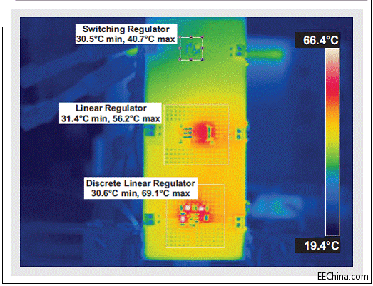 图4所示热图像表明了这类电路板设计的温升情况。这样设计电路板的目的是,让所有电路均不会干扰相邻电路的散热性能。表2表明,开关式稳压器具有低温升,其温度为11°C。输入和输出电压之间存在巨大差异时,相比线性电路,同步整流开关式稳压器的效率表现优异。(参见表3)有趣的是,我们注意到,集成线性电路的温升不同于离散线性电路。由于集成线性稳压器的封装(DDPak)更大,因此它的散热所分布面积也更大。使用SOT-23和SOT223封装的离散线性电路比DDPak小,并拥有更高的封装功耗额定值,从而让散热更加困难。