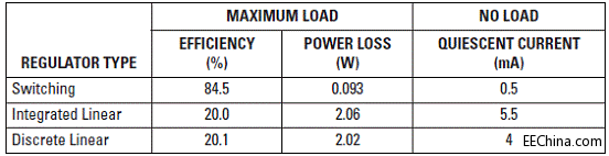 表3总结了所有三个电路的效率和功耗。注意,离散线性电路的静态电流小于集成线性电路。相比离散线性电路,集成线性稳压器内部电路的功耗更高,并拥有更多的功能。