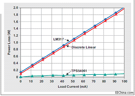 散热性能直接与每种稳压器的效率有关。图5显示了所有三种电路的效率比较情况。正如我们所预测的那样,在轻负载和全负载效率两方面,开关式稳压器均表现优异。在轻负载下,开关损耗和静态电流损耗更加明显,其解释了更轻负载下效率较低的原因。轻负载下时,最好是查看功耗曲线图(图6),而非效率曲线图,因为10mA下50%的效率差异看似为一个较大的余量。但是,负载消耗的电流较小。当输入电压为24V而输出电流为10mA时,开关式稳压器的功耗为2.8mW,集成线性稳压器的功耗则为345mW。在全负载条件下,开关式稳压器的测得功耗为0.093 W,而线性稳压器则为2.06W,其表明余量较宽并且性能获得明显改善。