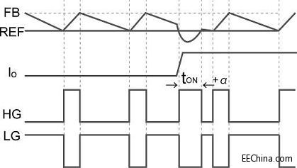 图3:ROHM独创的高速负载瞬态响应H3Reg控制●为了与内部电压控制比较器输入的标准电压(REF)进行比较,将被分压的输出电压反馈给FB引脚;●在正常运行中,H3Reg控制器一旦检测到FB引脚的电压低于REF电压,在下述公式规定的时间(tO