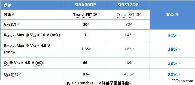 TrenchFET® IV是TrenchFET功率MOSFET家族中的最新一代产品。与TrenchFET III相比,TrenchFET IV的导通电阻(RDS(ON))和栅极电荷(QG, QGD)数值都有所减小,降低了同步DC/DC转换器中的损耗。过去,降低RDS(ON)通常会以更高的栅极电荷做为折中。但TrenchFET IV采用一种新的高密度设计,同时实现了优化的栅极电荷水平和更低的RDS(ON)。表1比较了TrenchFET IV产品SiRA00DP和采用以前最先进技术的SiR812DP TrenchFET Gen III功率MOSFET。新器件的RDS(ON)和Qg分别低30%和39%。