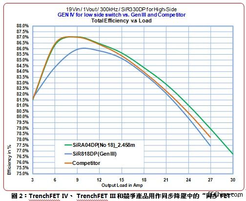 图1演示了在同步降压转换器中使用TrenchFET IV做为“控制FET”的情况,TrenchFET IV的效率比TrenchFET III高0.5%,电流最高达27A。