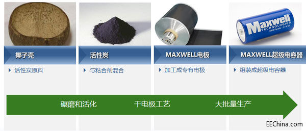 在生产成本上干电极技术也独具优势。业界领先的超级电容器厂商 Maxwell 表示,他们从椰子壳、杏仁壳、麦子等多种材料中来提取超级电容器中的核心材料 -- 碳,这些新材料的应用也是降低成本的一种方式。Maxwell 还拥有集中在电极的研发、生产和制造上大部分专利技术,超过35项专利技术及专有干电极工艺造就了其超级电容器的卓越性能优势。采用这种工艺可以生产出拥有总成本最低的电容器单体。由于使用的是无溶剂残留的高纯度材料,这种方式也更为绿色环保和节约能源、并且可以达到百分之百的回收再利用。