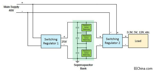 图1显示了一种高效率解决方案的框图,其中的负载是需要稳定输入电压(3.3V、5V、12V等)的器件。48V主电源为正常工作的开关稳压器2(SW2)供电,同时通过开关稳压器1(SW1)为超级电容组充电,使其电压达到25V。当主电源断开时,超级电容组向SW2供电,以维持负载的连续运行。