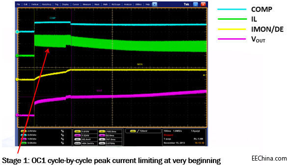 图5显示超级电容充电有多个阶段。开始时,在第1阶段,Vo几乎为0。ISL78268的IMON/DE引脚上的平均电流信号还未达到1.6V(期望充电电流的参考值),所以CI回路还未接通(engage)。在此阶段,电感器的峰值电流被逐周期限制于固定的OC阈值。在VOUT处于低水平(FB<0.4V)的充电阶段开始时,开关频率最大值被限制在50kHz,以预防所提到的因为低VOUT时的峰值电流限制而引起的电感器失控问题。