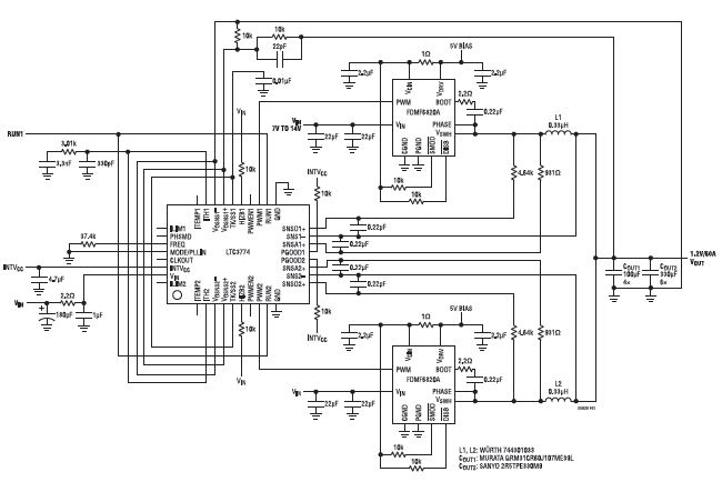 sw=400kHz的双相、1.2V/60A LTC3774转换器(7V≤VIN≤14V)">