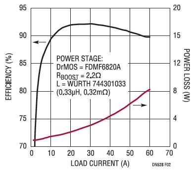 图1示出了一款工作在400kHz开关频率的双相1.2V/60A LTC3774转换器。每相的功率级是采用6mm x 6mm QFN封装的FDMF6820A DrMOS和具有0.325mΩ典型DCR的0.3μH单绕组铁氧体电感器。如图2所示,产生的满负载效率为89.8%。转换器的内核具有一个每平方英寸为50A的电流密度。