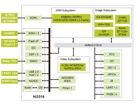 监控系统从传统的模拟CCTV向NVR数字监控转型的过程中,网络化,高清化,智能化逐渐成为趋势,行业对高清IP Camera的需求日趋明确与强烈,IP Camera也将脱离传统架构,采用性能更为强大,集成度更好的高端SOC芯片。以国内著名监控方案厂商海思一款产品为例 - Hi3516。 其内嵌 Arm A9 Core,H.264高清编码能力,智能图形处理分析,支持IP/TCP协议等等。
