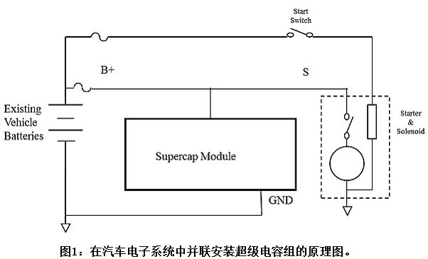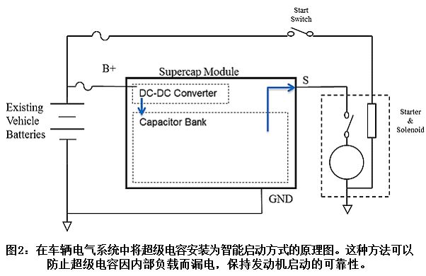 超级电容启动机方法设计用于保证发动机的启动,这种方法不容易受内部负载漏电的影响。超级电容直接连接启动机,铅酸电池只给车内其它电气系统供电,如收音机、照明和空调。图2中的原理图展示了超级电容启动机的典型配置。