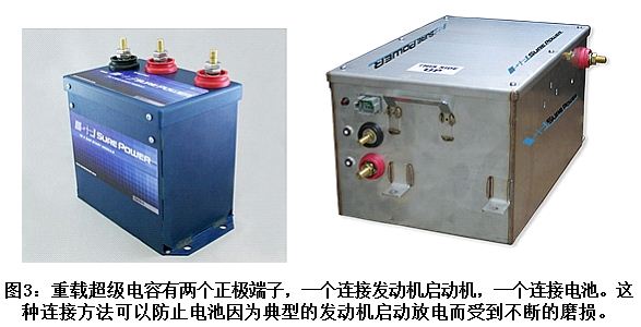 下面两张照片展示了用于重型车辆的超级电容设计。超级电容器上共有3个接线端子,其中一个正极端子只连接启动机,另外一个正极端子连接电池用于充电。这种接线方式可以确保最长的电池寿命,因为铅酸电池不用再承受发动机启动要求的1000安培典型放电电流。