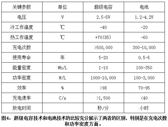 图4列出了超级电容规格和电池规格的比较表。这张表中的电池覆盖了多种技术,从最低性能的铅酸电池到更高性能的锂离子电池。