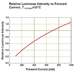 下图为LED相对光通量密度与顺向电流的关系图。由图中可以得知顺向电流越大,相对光通量密度就会越大。因此,若纹波电流太大,则光通量就会不均,亦会提高LED结温,影响LED性能和寿命。当无纹波电流或纹波电流小时,光通量则会较均匀,LED结温较稳定,则能维持LED的使用寿命。