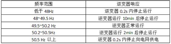 1.电网频率响应测试。测试逆变器是否在规定的频率范围内(电压正常的情况下)逆变器可以正常工作;在规定的频率范围段,逆变器正常运行规定的时间后,停止并网供电;在规定的频率范围外则认为电网频率异常,并网逆变器停止工作。其频率响应时间必须满足下表要求