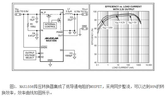 绝大多数电源IC的工作效率可以在特定的工作条件下测得,数据资料中给出了这些参数。Maxim的数据资料给出了实际测试得到的数据,其他厂商也会给出实际测量的结果,但我们只能对我们自己的数据担保。图1给出了一个SMPS降压转换器的电路实例,转换效率可以达到97%,即使在轻载时也能保持较高效率。