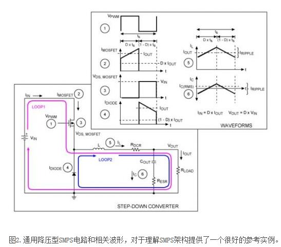 损耗是任何SMPS架构都面临的问题,我们在此以图2所示降压型(或buck)转换器为例进行讨论,图中标明各点的开关波形,用于后续计算。