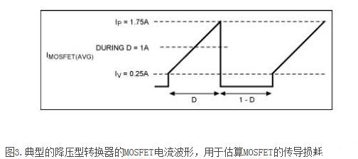 下式给出了更准确的估算损耗的方法,利用IP和IV之间电流波形I2的积分替代简单的I2项 PCOND(MOSFET) = [(IP3 - IV3)/3]×RDS(ON)×D = [(IP3 - IV3)/3]×RDS(ON)×VOUT/VIN式中,IP和IV分别对应于电流波形的峰值和谷值,如图3所示,MOSFET电流从IV线性上升到IP,例如:如果IV为0.25A,IP为1.75A,RDS(ON)为0.1Ω,VOUT为VIN/2 (D = 0.5),基于平均电流(1A)的计算结果为: PCOND(MOSFET) (使用平均电流) = 12×0.1×0.5 = 0.050W.