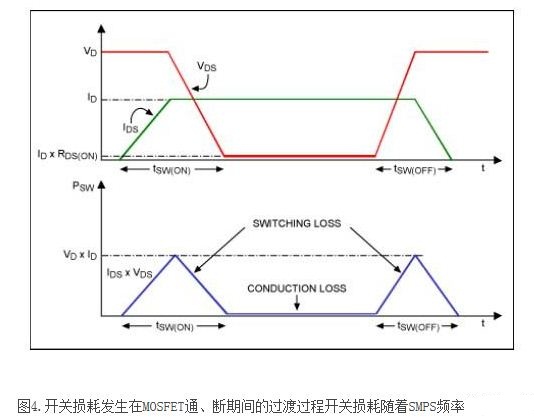 图4所示MOSFET的漏源电压(VDS)和漏源电流(IDS)的关系图可以很好地解释MOSFET在过渡过程中的开关损耗,从上半部分波形可以看出,tSW(ON)和tSW(OFF)期间电压和电流发生瞬变,MOSFET的电容进行充电、放电。图4所示,VDS降到最终导通状态(= ID×RDS(ON))之前,满负荷电流(ID)流过MOSFET.相反,关断时,VDS在MOSFET电流下降到零值之前逐渐上升到关断状态的最终值。开关过程中,电压和电流的交叠部分即为造成开关损耗的来源,从图4可以清楚地看到这一点。