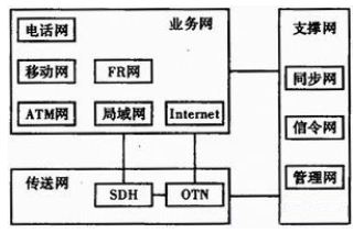 从功能的角度看,一个完整的现代通信网由业务网、传送网和支撑网3部分组成。其中,业务网包括固定电话网、移动通信网、FR网、局域网ATM网和Internet等;传送网包括SDH和光传送网;支撑网包括信令网、管理网和同步网如图1所示。