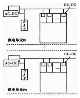 (3)分布式供电。先由大功率的不间断供电系统提供统一的-48 VDC或24 VDC,然后集中给通信网供电。设备机架每块电路板上各有一个或几个小功率电源(DC—DC变换器),将-48 VDC或24 VDC的母线电压直接转换成电路板所需的电压。