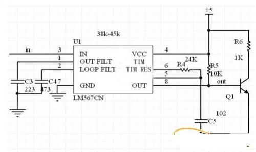 LM567是锁相环电路,8脚双列直插封装。第5、6脚外接的电阻和电容决定了内部压控振荡器的中心频率。1、2脚通常分别通过一个电容器接地,产生输出滤波网络和环路单级低通滤波网络。2脚接的电容决定锁相环路的捕捉带宽:电容值越大,环路带宽越窄。压控振荡器的中心频率和滤波带宽可由式子3和式子4决定。