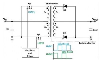 与推挽式转换器相似,未调节型隔离式DC/DC转换器的其他常用拓扑是半桥和全桥(H桥)式转换器。由于成本低且电路十分简单,因此这些未调节型隔离式DC/DC转换器常被用作DC变压器,以提供电流隔离。低压降(LDO)稳压器通常用作后置稳压器,以提供低噪声和低纹波电源。