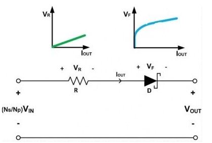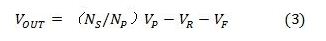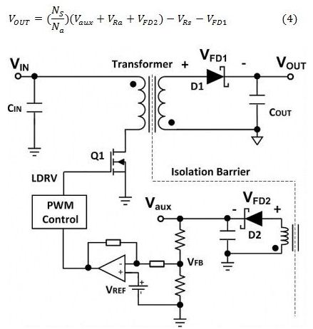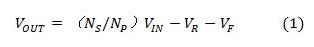 式中的VRs和VRa分别是次级绕组和辅助绕组的等效电阻电压降。VRs、VRa、VFD1和VFD2均为其自身电流的函数。在次级绕组和辅助绕组中流动的电流是不均匀的,因而在VOUT和Vaux之间的负载调节中导致失配。结果,VOUT的负载调节就没有Vaux那么好。隔离式输出与VIN无关,这表明可获得优良的线路输入电压调节性能。由于交叉调节输出取决于负载电流范围,故而通常可以实现5%至10%的输出电压调节。