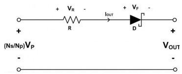 推挽式转换器实质上是一种正向导出式拓扑(forward-derived topology)。当其以50%的固定占空比运作时,输出电压调节可以使用图4中的等效电路来详细阐述。R是次级变压器绕组和走线的等效电阻。输出电压可由式(1)来表达: