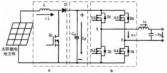 逆变器的主电路结构按照输出的隔离形式分为工频变压器隔离方式,高频变压器隔离方式,非隔离3 方式种。采用工频变压器进行隔离的逆变器,具有良好的抗雷击和消除尖波的性能,电路简单,变换只有一级,但是主变压器和滤波电感体积大。采用高频变压器的逆变器比工频变压器隔离的逆变器体积小,重量轻,成本低。但是,经多级变换,回路较为复杂,效率问题比较突出。了进一步降低成本,提高效率,采用无变压器无隔离方式逆变器主电路,如图1 所示,其中(a)部分电路为为boost 升压电路,(b)部分电路为全桥逆变电路。
