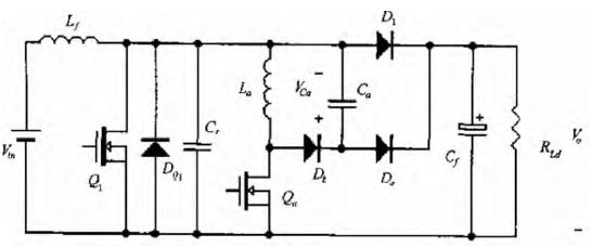 图2 中Q1为变换器的主开关管,Qa为辅助开关管,D1为主二极管,其他电路器件(二极管Dt、Da,电感La,电容Cr、Ca)为构成辅助谐振回路的元器件, 其中DQ1和Cr分别是主开关管Q1的反并联二极管和输出结电容。该电路具有如下特点: