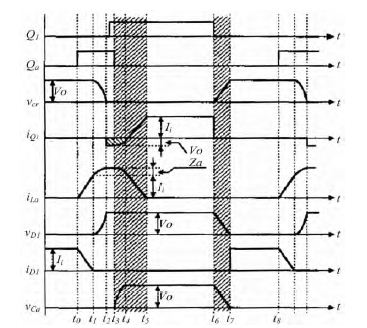 在t6时刻,主开关管Q1关断,升压电感电流同时给Cr充电,给Ca放电,由于有Cr和Ca,Q1是零电压关断。